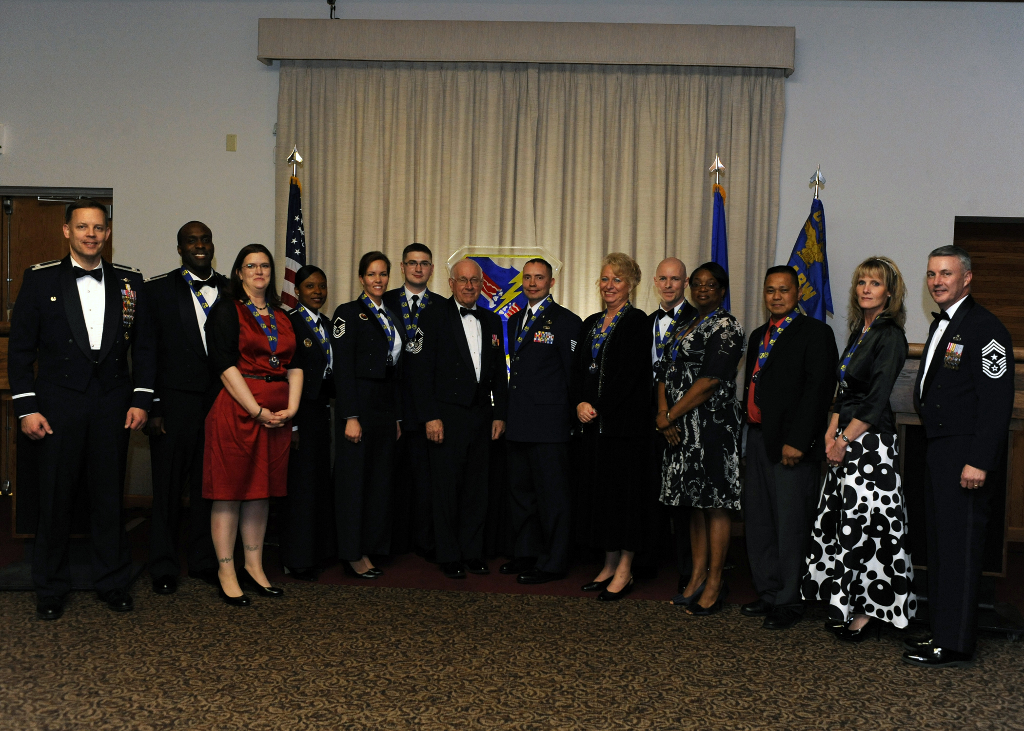 The 99th Air Base Wing annual award winners pose for a group photo during an awards banquet Feb. 10th, 2012 at the Nellis Club, Nellis Air Force Base, Nev. The awards recognize Airmen and civilians for exceptional performance in the workplace and outstanding contributions to the local community over the past year. (U.S. Air Force photo by Airman 1st Class Matthew Lancaster)