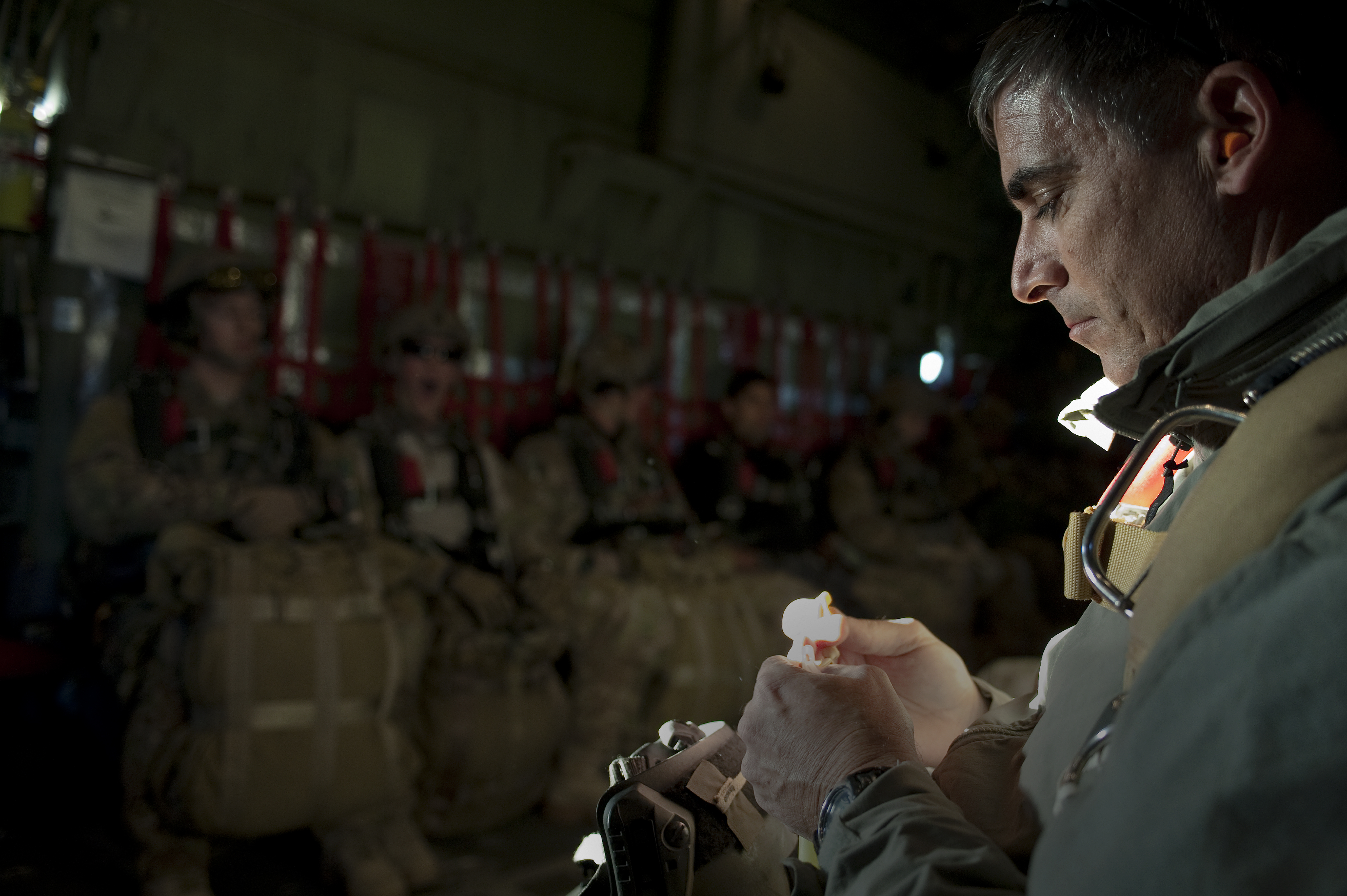 A U.S. Air Force pararescueman, 58th Rescue Squadron, looks over his gear prior to jumping out of a C-130 Hercules, Air National Guard, Long Island, NY, during a military static-line jump Jan. 13, 2012, at Nellis Air Force Base, Nev. Pararescuemen are trained to provide emergency medical treatment in adverse terrain and conditions in combat or peacetime. (U.S. Air Force photo by Staff Sgt. Christopher Hubenthal/Released)