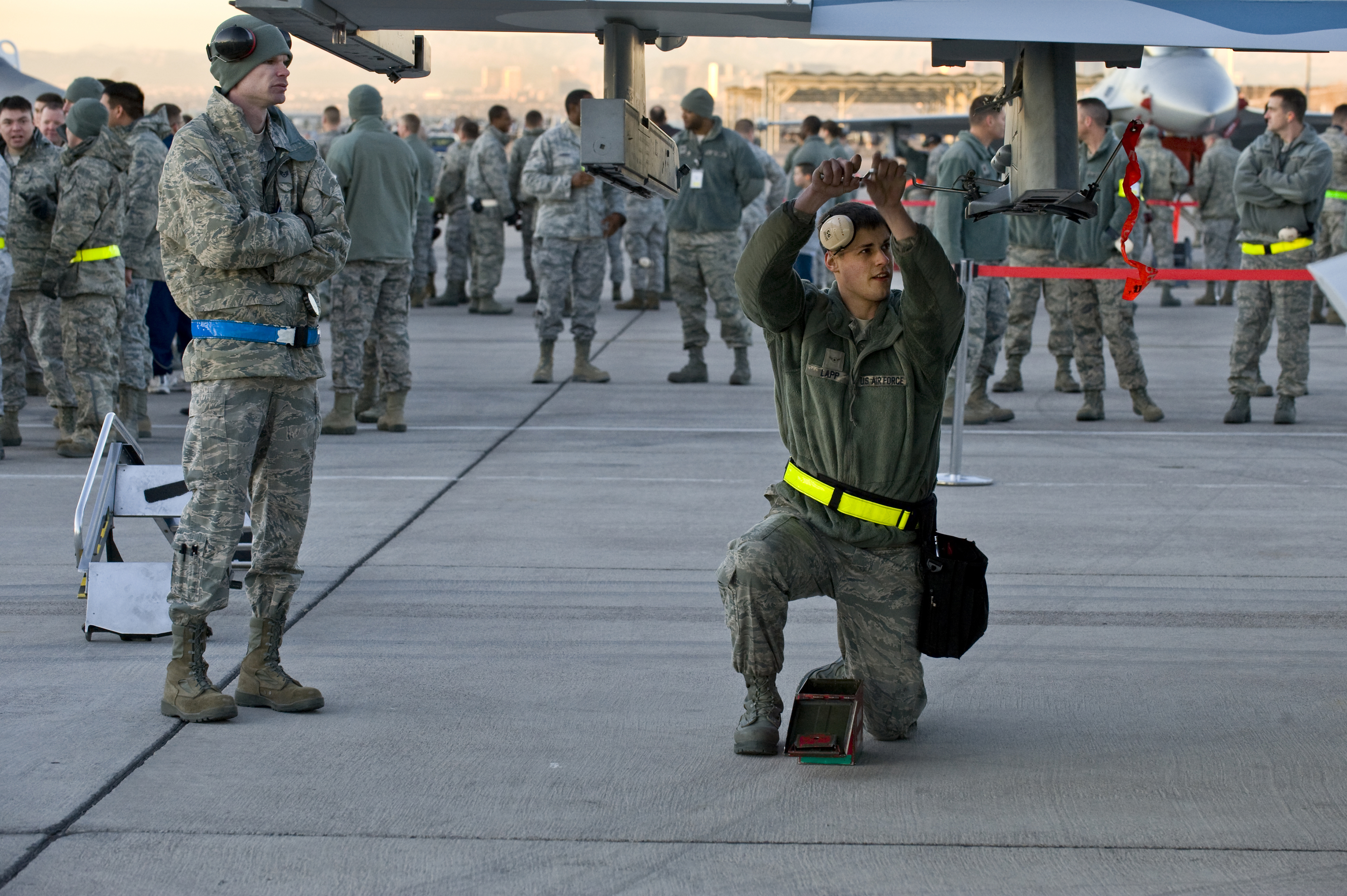 U.S. Air Force Airman Robert Lapp 57th Aircraft Maintenance Squadron aircraft armament systems journeyman, prepares an F-16 Fighting Falcon for bomb loading while Staff Sgt. Justin Vandevander, 57th Maintenance Squadron, judges Airman Lapp during the quarterly weapons load competition Jan. 6, 2012, at Nellis Air Force Base, Nev. Weapons load competitions are conducted quarterly to keep Airmen sharp and recognize superior performers. Weapons load teams are evaluated for use of the checklist, safety, and overall speed. (U.S. Air Force photo by Staff Sgt. William P.Coleman/Released)