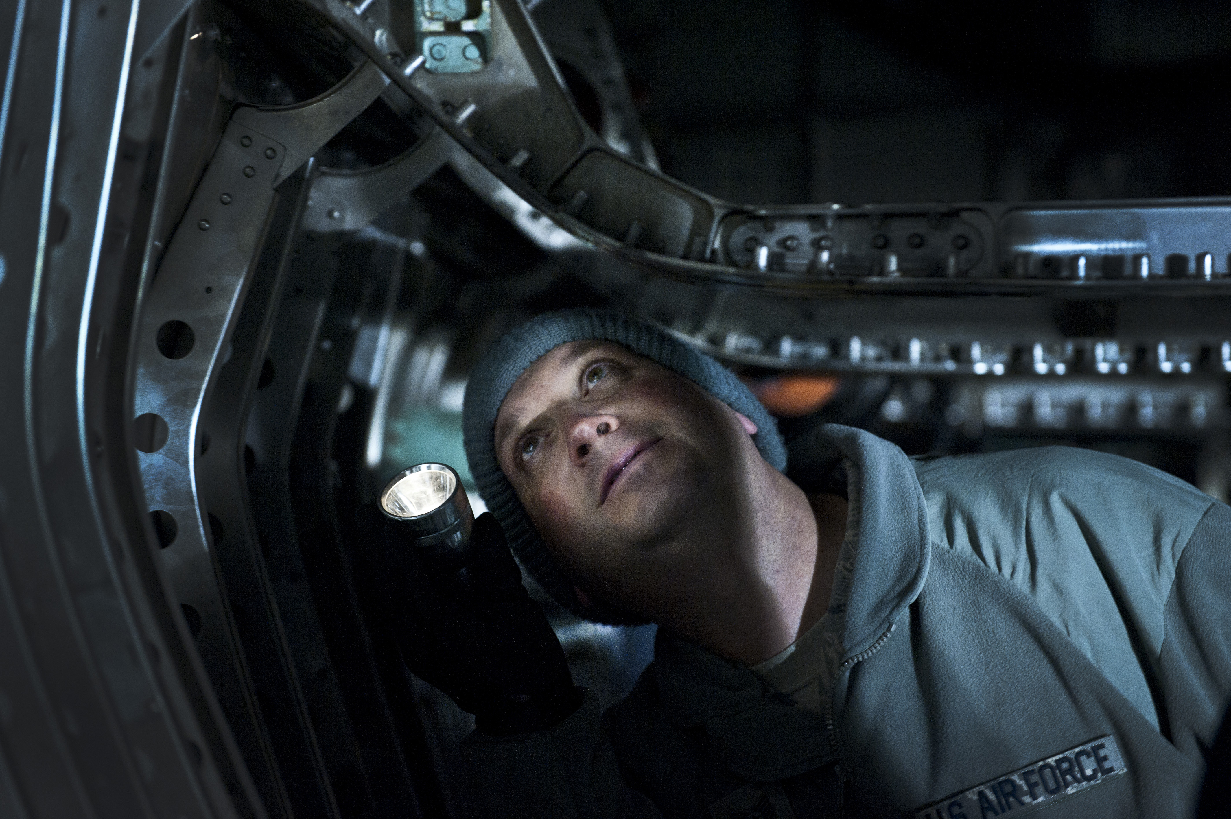 U.S. Air Force Tech. Sgt. Adam Howard, 57th Maintenance Squadron quality assurance inspector, inspects an F-15 Strike Eagle during the U.S. Air Force Weapons School mission employment exercise Dec. 6, 2011, at Nellis Air Force Base, Nev. The two-week-long mission employment phase is the final part of a five-and-a-half-month Weapons School graduate course that showcases the students newly acquired skills to test their ability to plan, execute and lead complex missions. (U.S. Air Force photo by Airman 1st Class George Goslin/Released)
