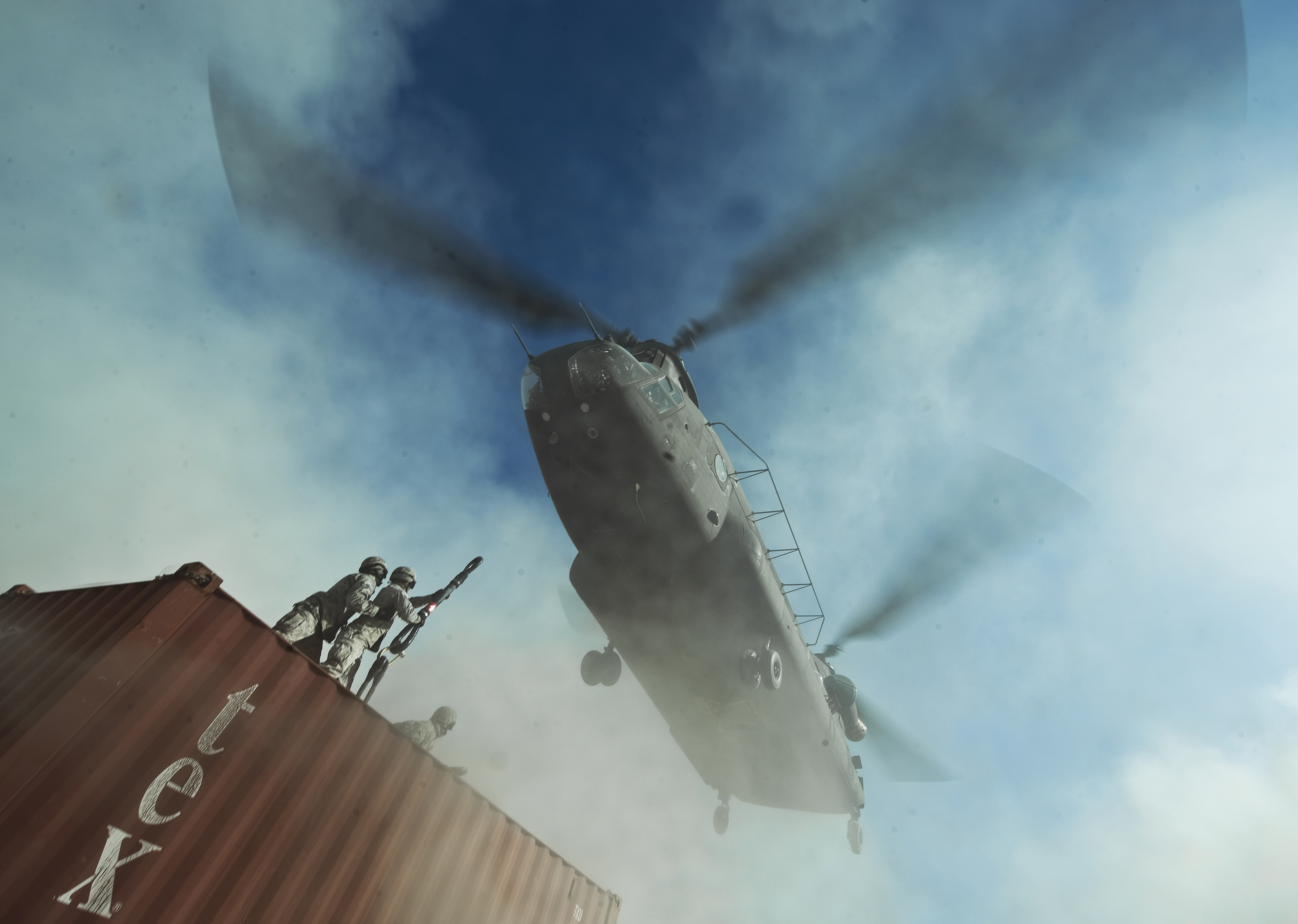 U.S. Air Force Airmen, 820th RED HORSE Squadron airborne flight, prepare a connex box for a sling-load as a CH-47 Chinook, Army National Guard, Stockton, CA, approaches during a peacetime operation Nov. 9, 2011, at Alamo, Nev. The sling load training and air assault certification of 820th RHS airborne flight Airmen proved crucial in the success of the quick response operation. (U.S. Air Force photo by Staff Sgt. Christopher Hubenthal/Released)