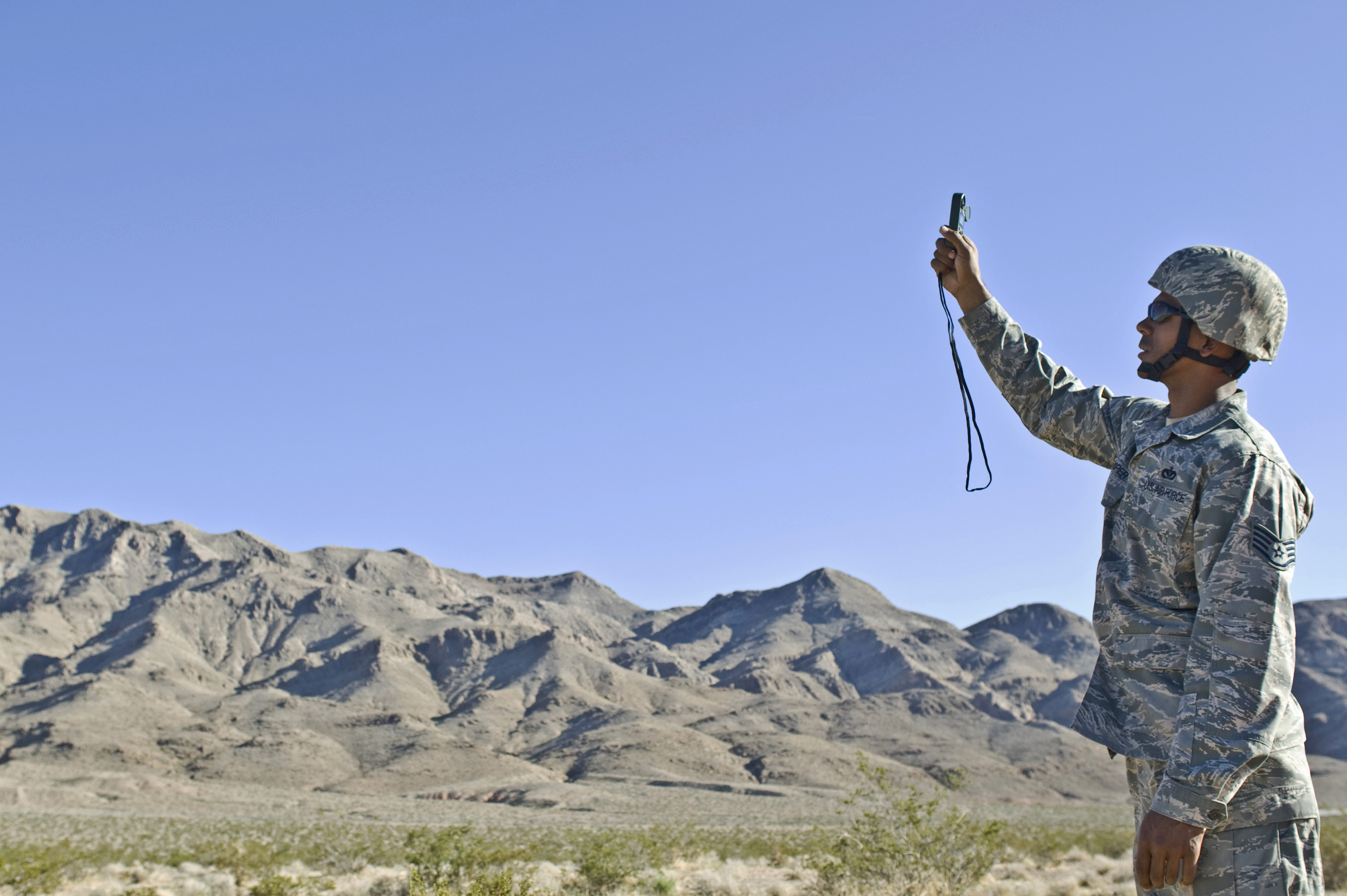 U.S. Air Force Staff Sgt. Odell Glasper, 820th RED HORSE heavy equipment and pavement craftsman, checks the wind speed in preparation for an airdrop training mission Oct. 15, 2011, at Nellis Air Force Base, Nev. RED HORSE Airmen perform airdrop missions to stay current on training and certifications, which enables them to perform jump missions and operate their own drop zones. (U.S. Air Force photo by Airman 1st Class Matthew Lancaster/Released)