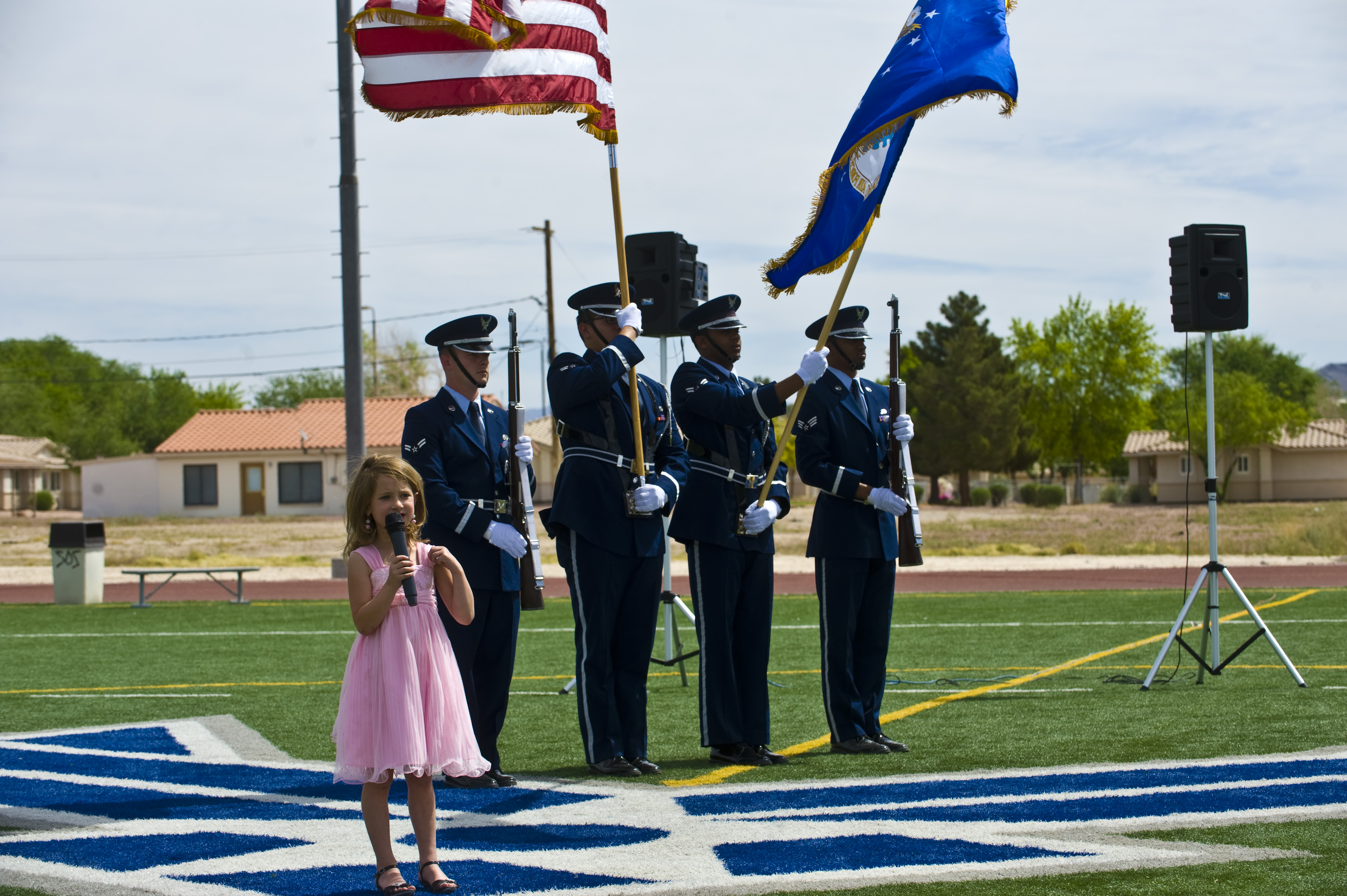 Ella McFadden, daughter of 1st Lt. Michael McFadden, sings the national anthem while the Nellis Air Force Base Honor Guard post the colors for the opening of the 99th Logistics Readiness Squadron Life of a Warrior Challenge April 11, 2014, at Nellis Air Force Base, Nev. A total of 19 teams participated in this challenge. (U.S. Air Force photo by Airman 1st Class Jake Carter)