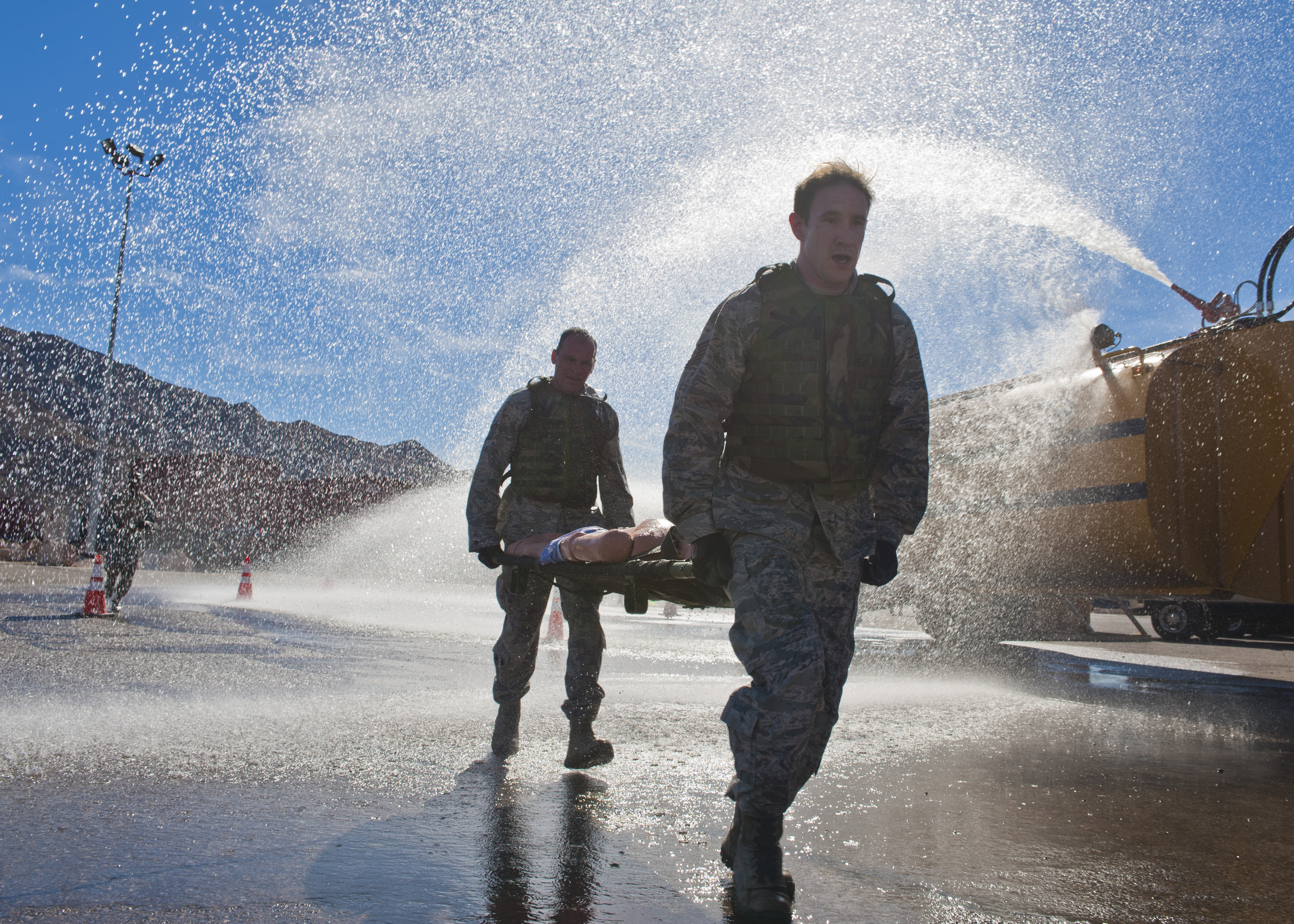 The 820th RED HORSE "LG" team carry a litter with a 145 pound dummy while getting sprayed with water during the 820th RED HORSE Life of a Warrior challenge in Area 2 Feb. 13, 2014, at Nellis Air Force Base, Nev. The course consisted of six stations that tested teams mentally and physically. Life of a Warrior is designed for people to strive to achieve his or her maximum potential.  (U.S. Air Force photo by Senior Airman Christopher Tam)