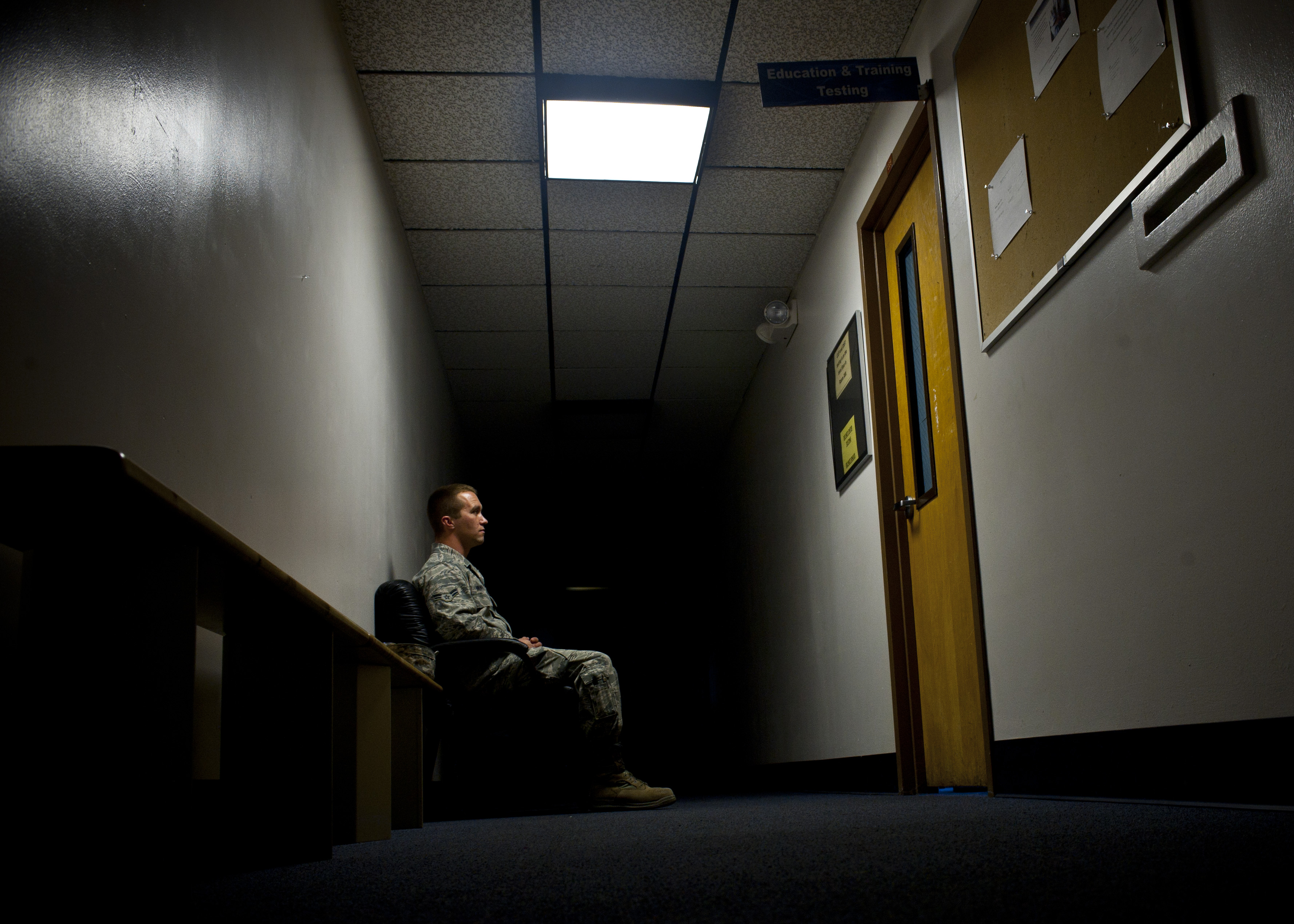 An Airman waits to take his Career Development Course end of course test Oct. 11, 2013, in the hall at the 99th Force Support Squadron Military Personnel Section on Nellis Air Force Base, Nev. The 99th FSS will continue to provide professional military education testing throughout the government shutdown. (U.S. Air Force photo by Staff Sgt. Michael Charles)