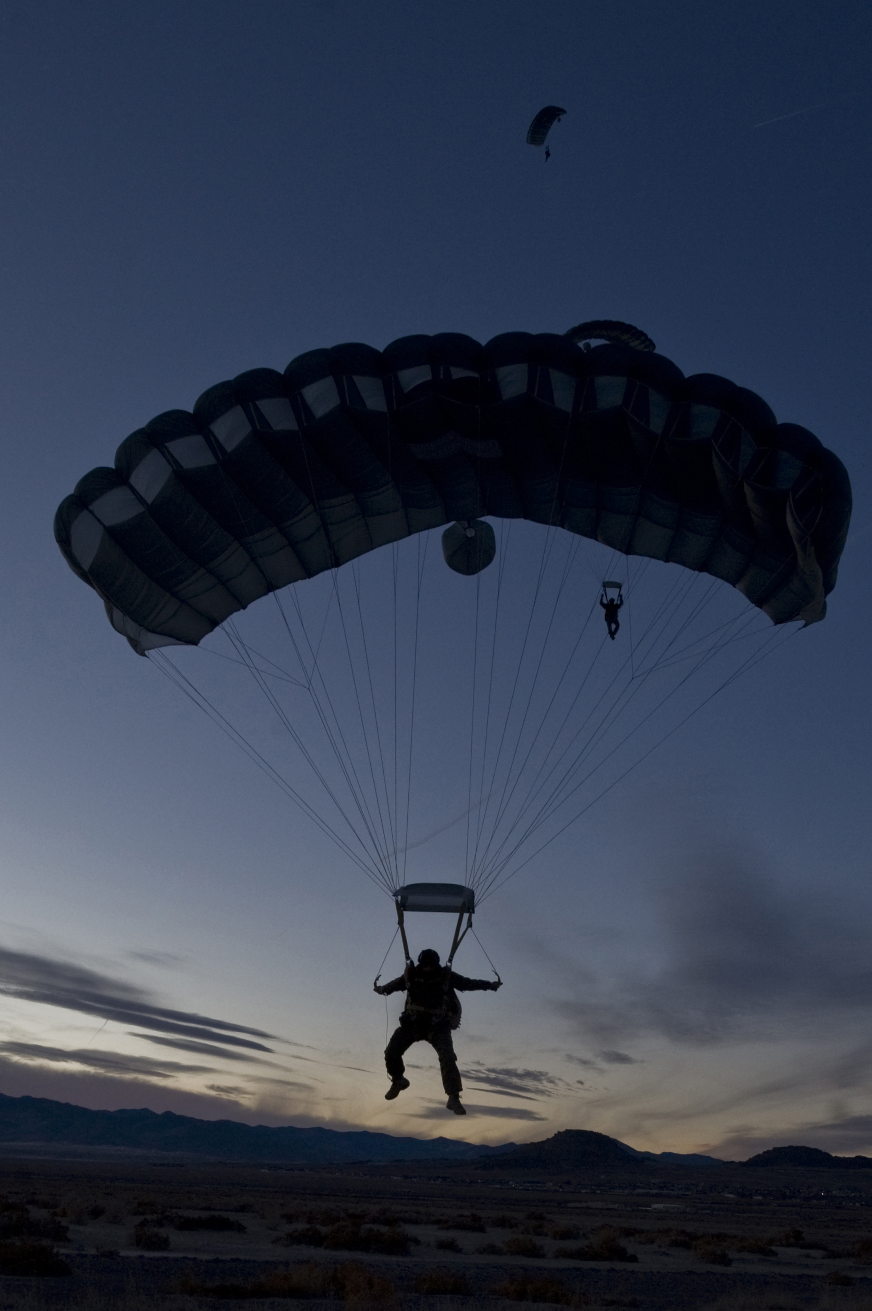 U.S. Air Force pararescuemen, 58th Rescue Squadron, come in for landing during a military freefall jump Jan. 11, 2012, at Nellis Air Force Base, Nev. Pararescuemen are trained to provide emergency medical treatment in adverse terrain and conditions in combat or peacetime. (U.S. Air Force photo by Airman 1st Class Daniel Hughes/Released)