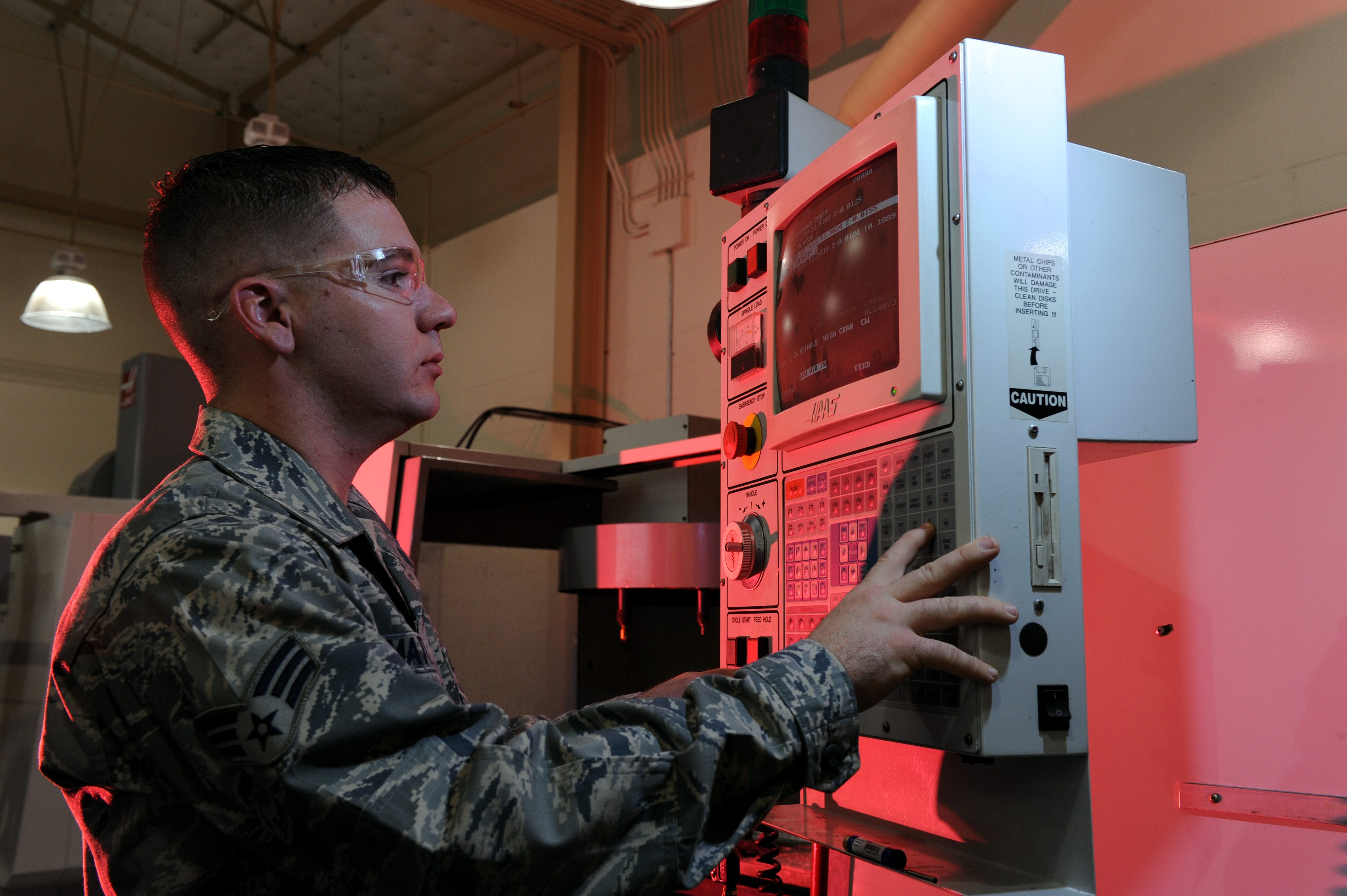 Senior Airman Chad Mattingly, a metals technician with the 57th Component Maintenance Squadron, programs a layout design into the computer numerical control (CNC), April 16, Nellis Air Force Base, Nev. The 57th CMS uses machines like the CNC to make structural repairs to components for various aircraft.(U.S. Air Force photo by/Senior Airman Nadine Y. Barclay/RELEASED)