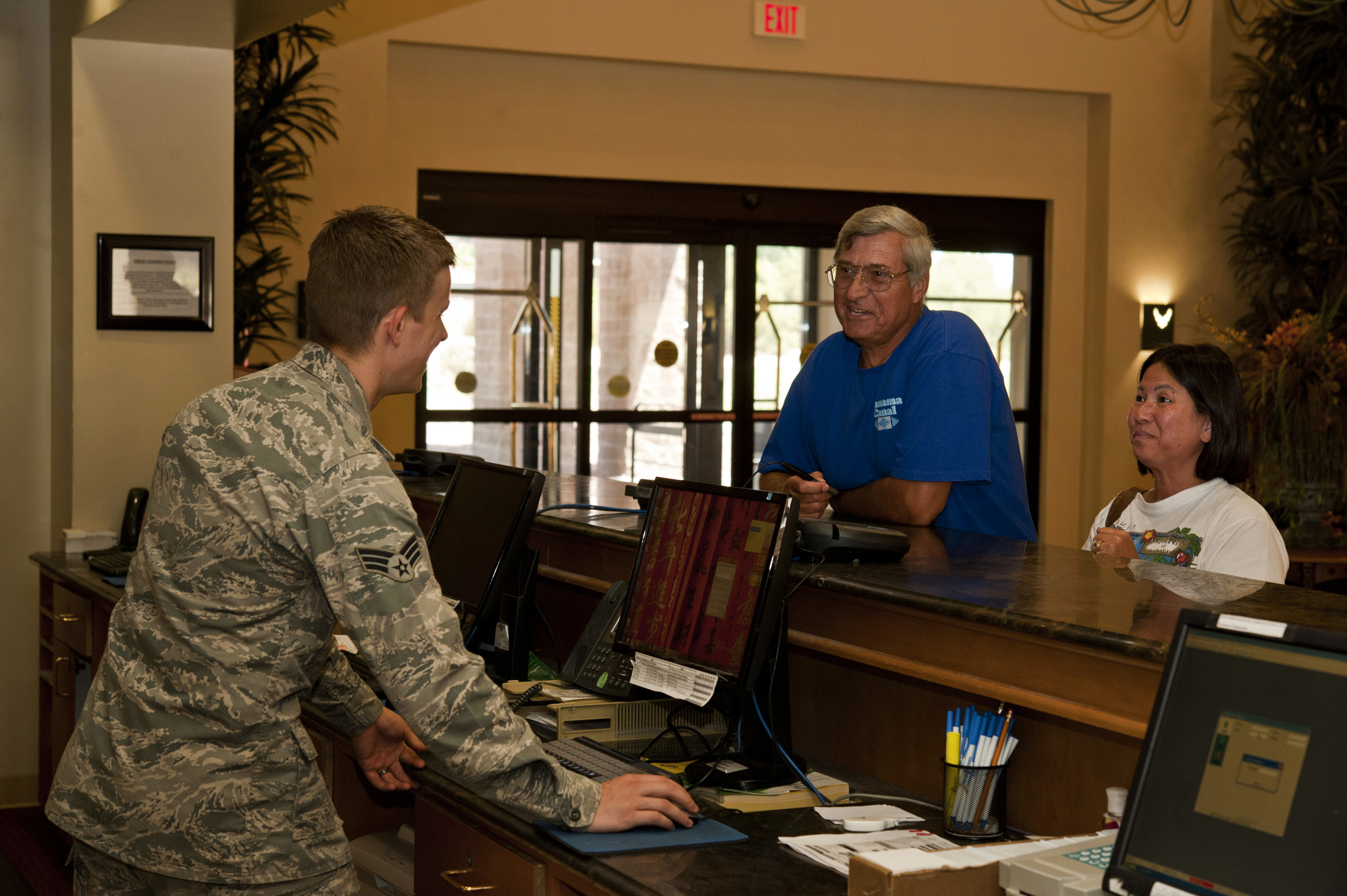 U.S. Air Force Senior Airman Angelo Cavaretta, 99th Force Support Squadron guest services representative, provides lodging information to Tom and Anh Szvorkm at the Nellis Inn July 18, 2013, at Nellis Air Force Base, Nev. The guest services representative is responsible for checking in guests as well as ensuring guests check out on time. (U.S. Air Force photo by Senior Airman Daniel Hughes)