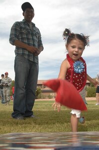 Nazarae Baldonado, 2, throws a bean bag as part of a game as her father, Airman 1st Class Jarrad Baldonado, 99th logistics Readiness Squadron materiel management apprentice, watches, during the Fall Festival Oct. 5, 2012, at Nellis Air Force Base, Nev. Activities military service members and their