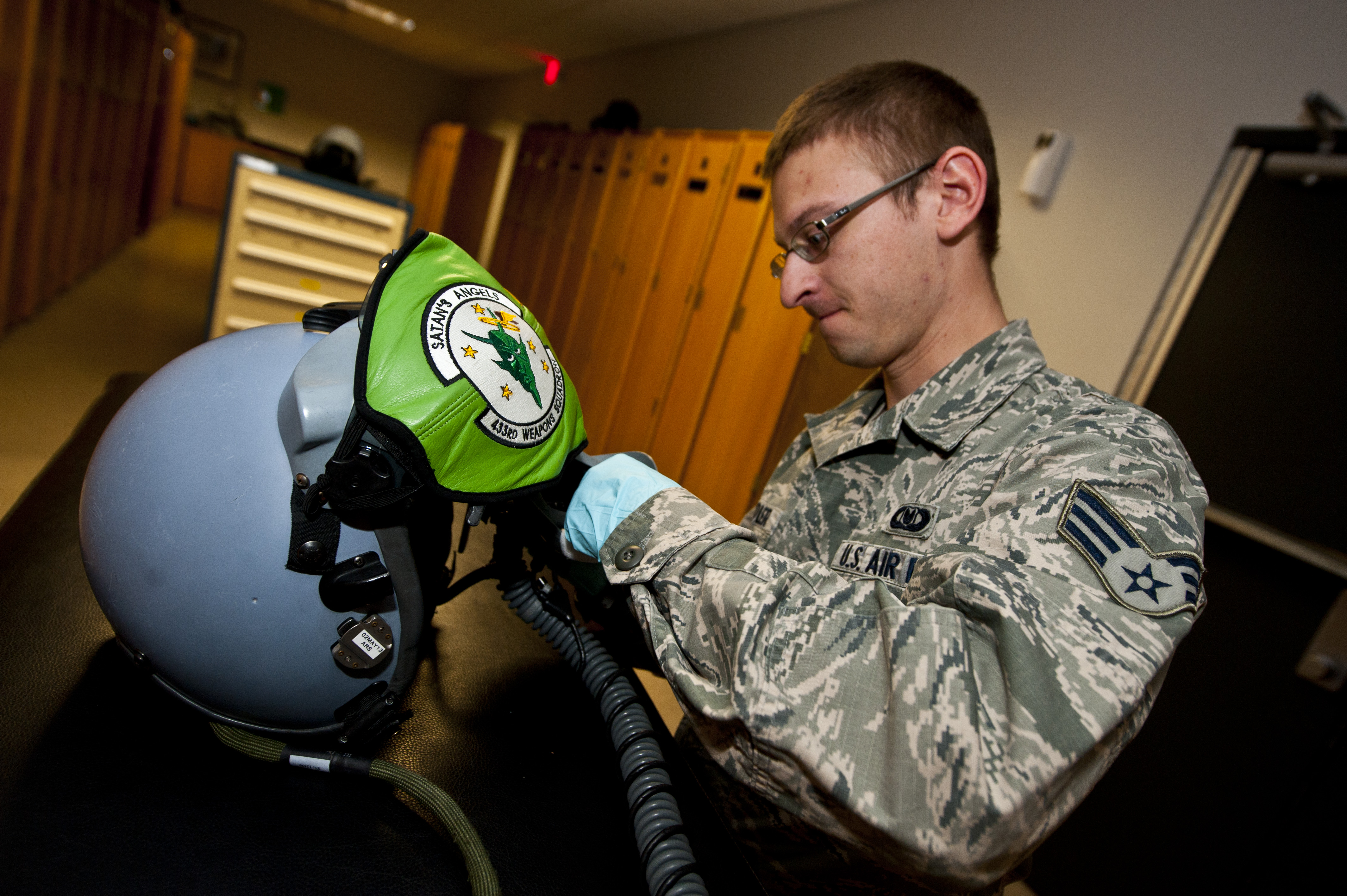 Senior Airman Brett Schindler, U.S. Air Force Weapons School aircrew flight equipment journeyman, performs an inspection on a flight helmet April 12, 2013, at Nellis Air Force Base, Nev. Life support installs different pieces of equipment daily depending of the flight crews that conduct missions that day. (U.S. Air Force photo/Senior Airman Brett Clashman)