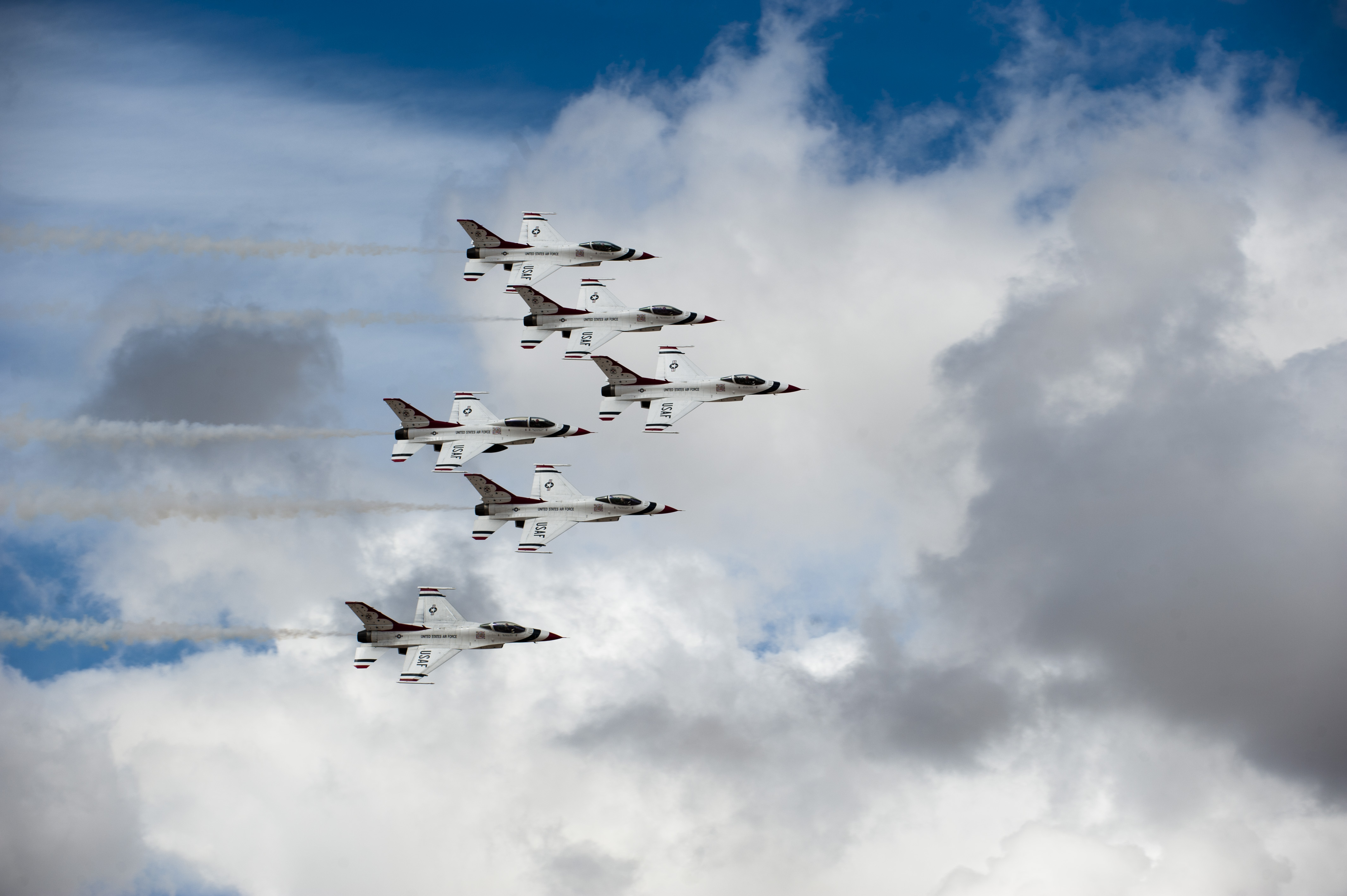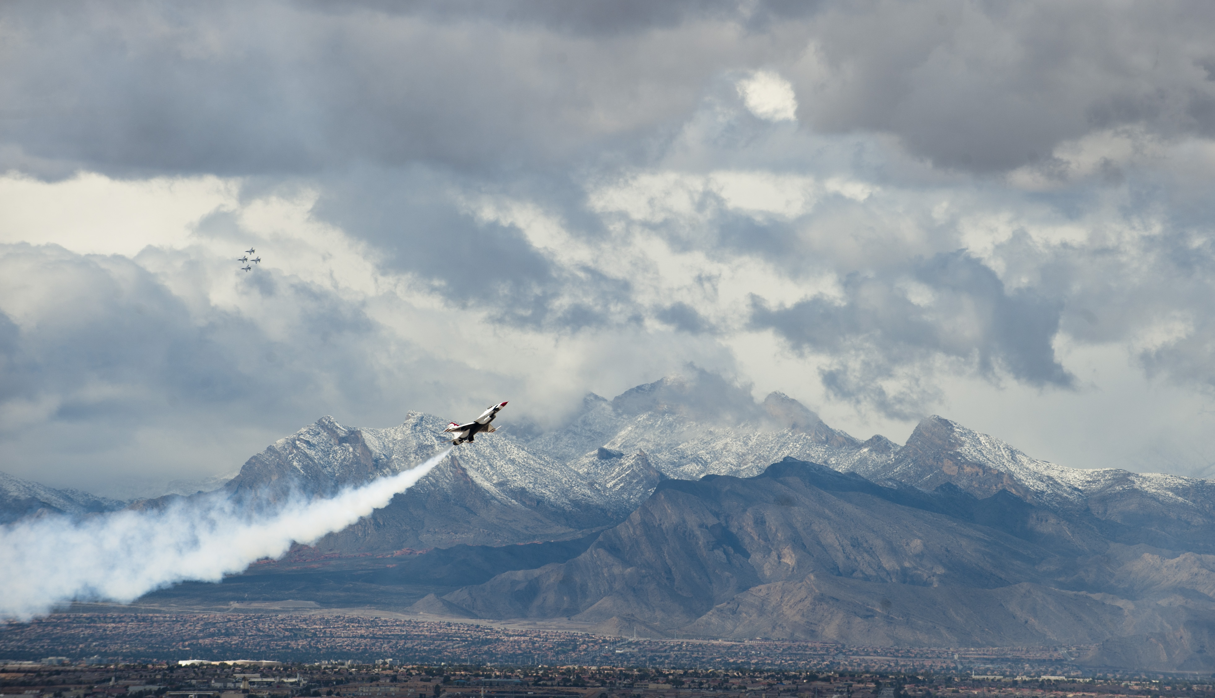 The U.S. Air Force Air Demonstration Team, the Thunderbirds, perform their demonstration in preparation for the commander of Air Combat Command at Nellis Air Force Base, Nev., March 2, 2015. Millions of people have witnessed the Thunderbirds demonstrations, and in turn, they’ve seen the pride, professionalism and dedication of hundreds of thousands of Airmen serving at home and abroad. (U.S. Air Force photo by Senior Airman Thomas Spangler)