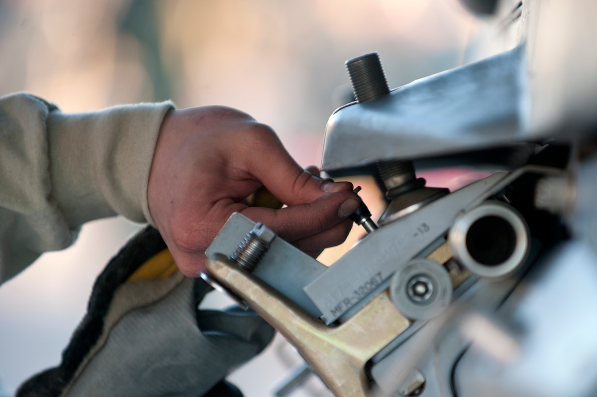 Airman 1st Class Dwight Mallari, 57th Aircraft Maintenance Squadron Tomahawk Aircraft Maintenance Unit load crew member, loosens screws in preparation to load inert munitions onto an F-16 Fighting Falcon during the annual load crew competition on the flight line Jan. 17, 2014, at Nellis Air Force Base, Nev. The load crew competition boosts morale and promotes an environment of friendly competition. (U.S. Air Force photo by Senior Airman Matthew Lancaster)