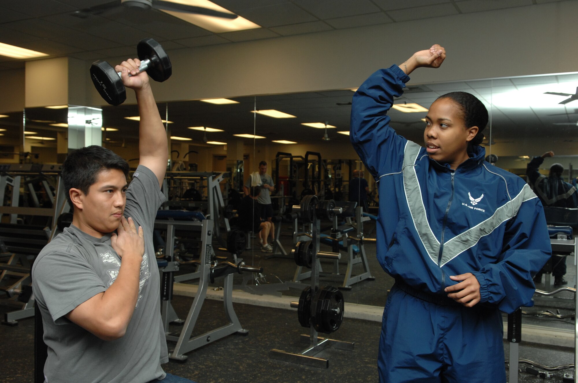Airman 1st Class Nikole Glenn, 99th Services Squadron fitness specialist, instructs Ruben Sarino on the proper way to work the shoulder muscles during a training session at the Nellis Air Force Base Sports and Fitness Center. (U.S. Air Force photo by Senior Airman Nadine Y.Barclay)