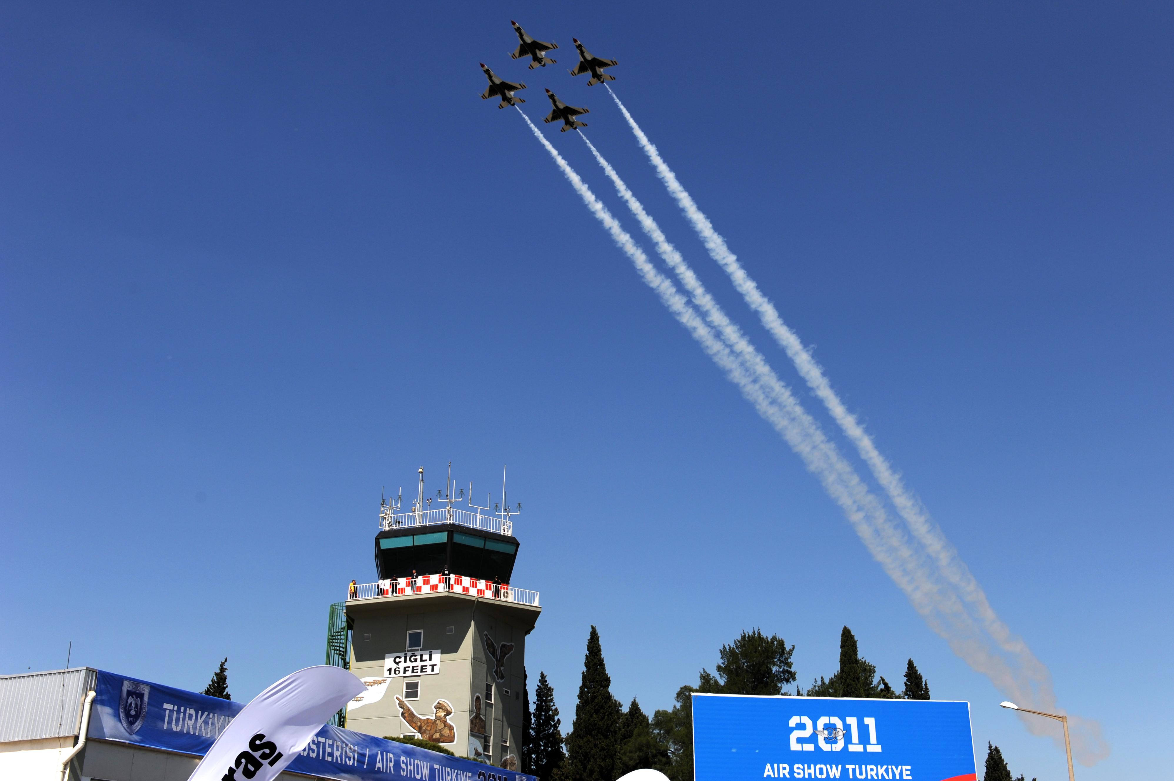 The U.S. Air Force Air Demonstration Squadron "Thunderbirds", fly the Diamond formation during Air Show Turkiye 2011 at Cigli Air Base, June 5. The Thunderbirds performed alongside other world renowned aerial demonstration teams, to honor 100 years of Turkish aviation. (U.S. Air Force photo/Staff Sgt. Larry E. Reid Jr., Released)