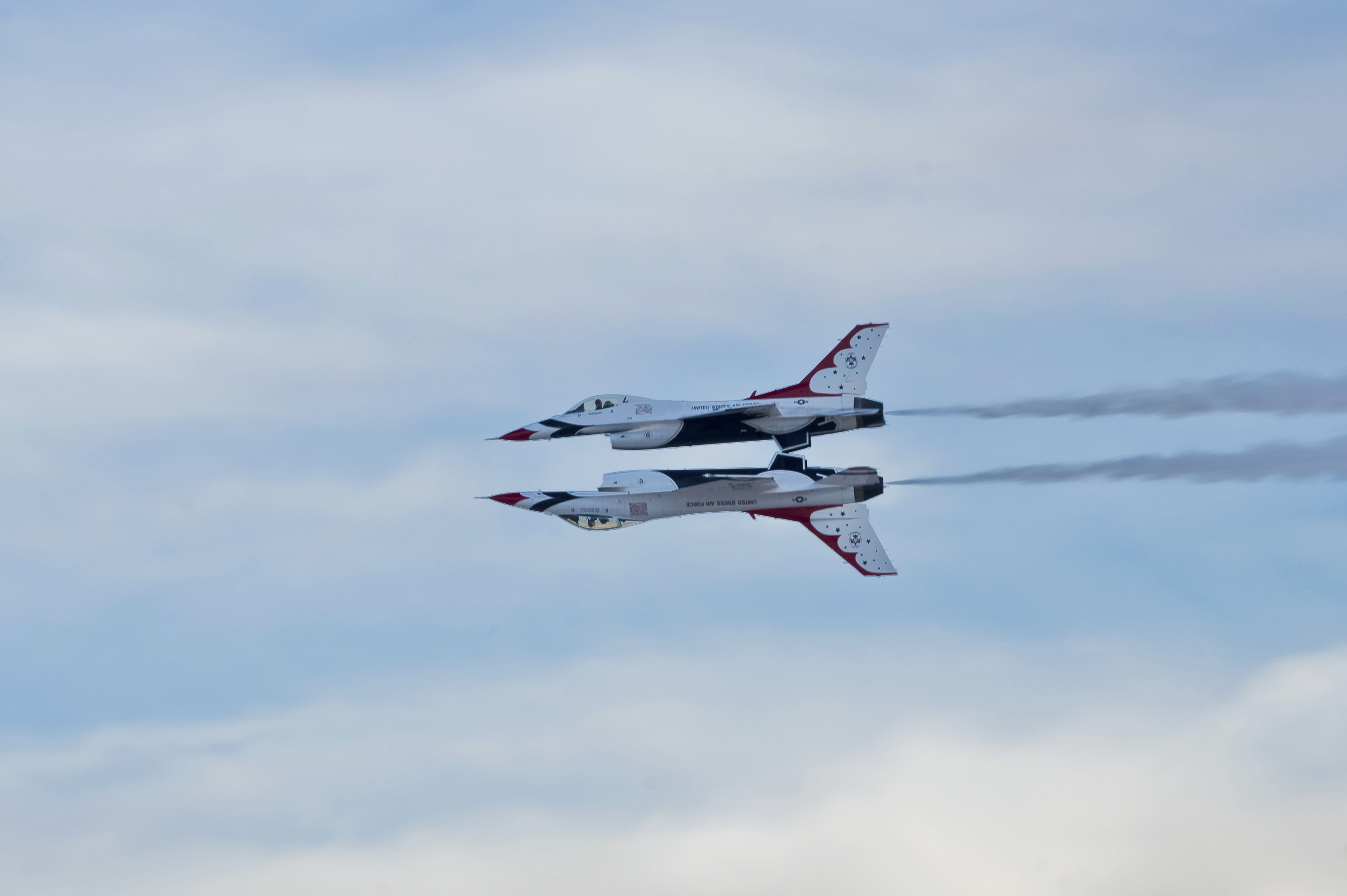The United States Air Force Air Demonstration Squadron Thunderbirds, perform a calypso pass during the annual Aviation Nation open house Nov. 10, 2012, at Nellis Air Force Base, Nev. During the 2012 season, the team spent more than 200 days on the road representing Airmen during its 59th year. (U.S. Air Force photo by Airman 1st Class Christopher Tam)