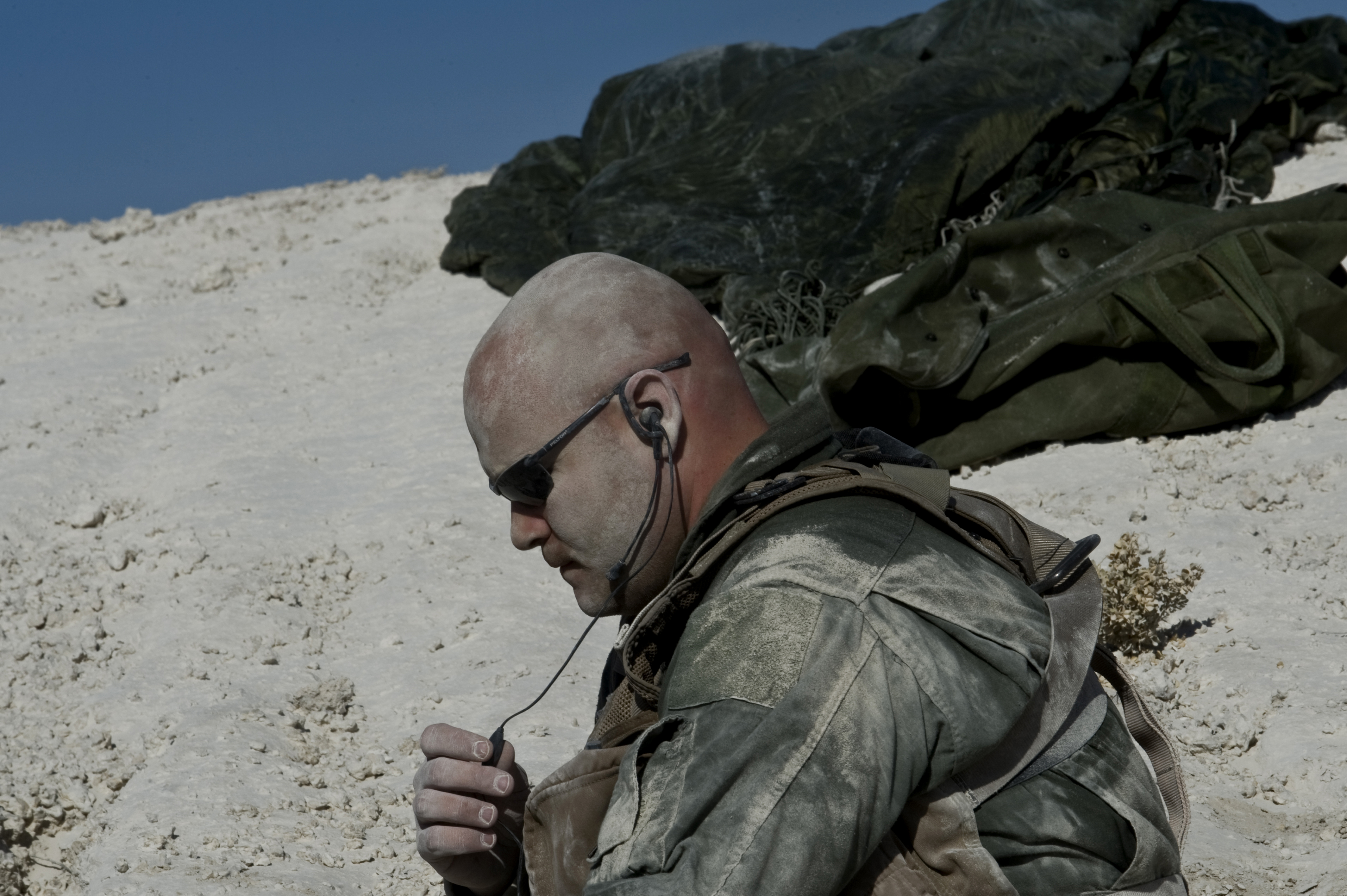A U.S. Air Force independent duty medical technician, 58th Rescue Squadron, simulates the role of a downed pilot during a combat training mission Jan. 18, 2012, at the Nevada Test and Training Range. Pararescuemen are trained to provide emergency medical treatment to downed pilots and other injured personnel in adverse terrain and conditions during combat or peacetime. (U.S. Air Force photo by Airman 1st Class Daniel Hughes/Released)