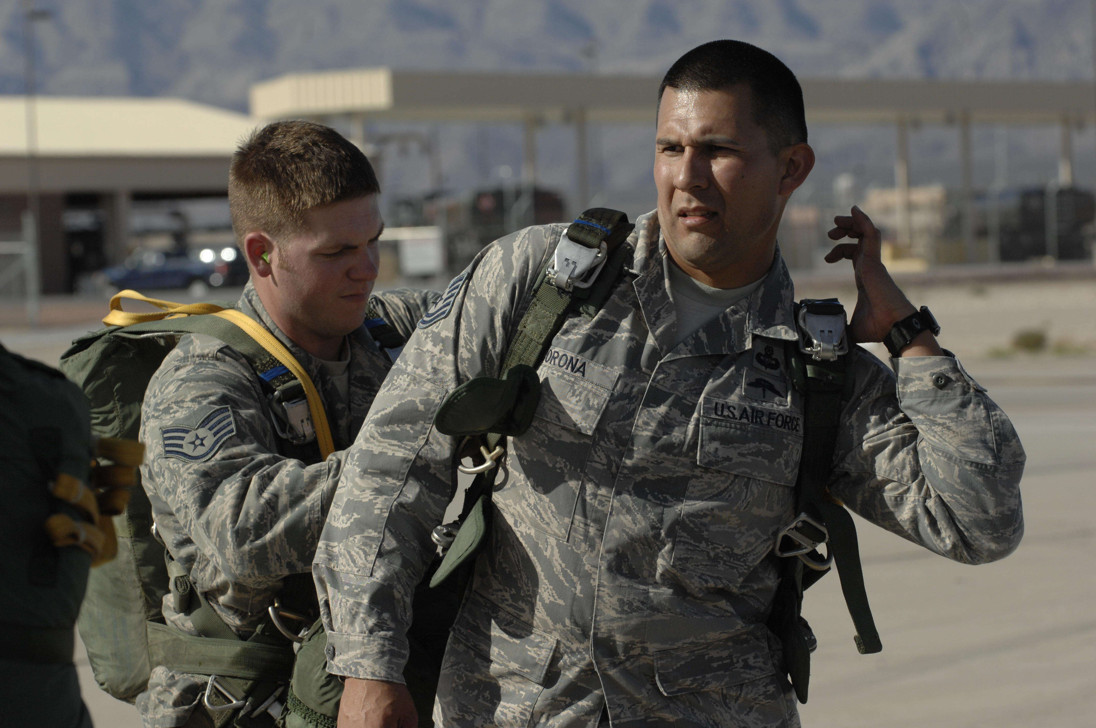 From left, U.S. Air Force Staff Sgt. Sean McCarty 820th RED HORSE Airborne firefighter checks gear for Tech. Sgt. Francisco Corona, 6th Combat Training Squadron joint terminal attack controller instructor, prior to a jump mission Oct. 15, 2011, at Nellis Air Force Base, Nev. RED HORSE and 6 CTS Airman perform airdrop missions to stay current on training and certifications, enabling them to perform jump missions and operate their own drop zones. (U.S. Air Force photo by Senior Master Sgt. Kevin Gruenwald/Released)
