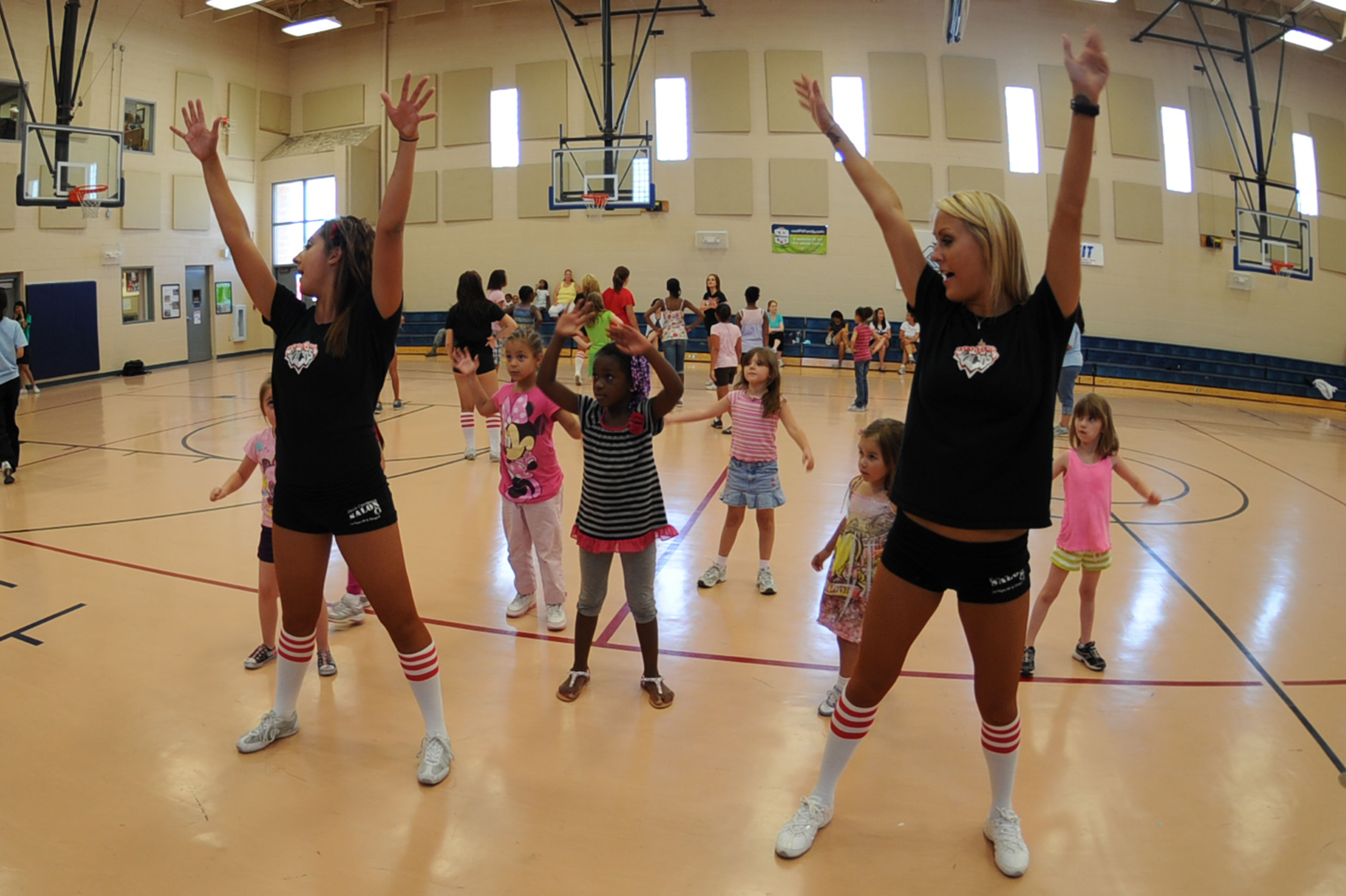 Kailli Mitchm and Lama Carey, Las Vegas Locomotion dancers, teach dance moves to young girls at the Nellis Youth Center Aug. 5, 2011, at Nellis Air Force Base, Nev. The Las Vegas Locos football players, dancers and coaches toured Nellis AFB and spent time at the Nellis Youth Center teaching the children the fundamentals of football, dancing and sportsmanship. (U.S. Air Force photo by Staff Sgt. Taylor Worley/ Released)
