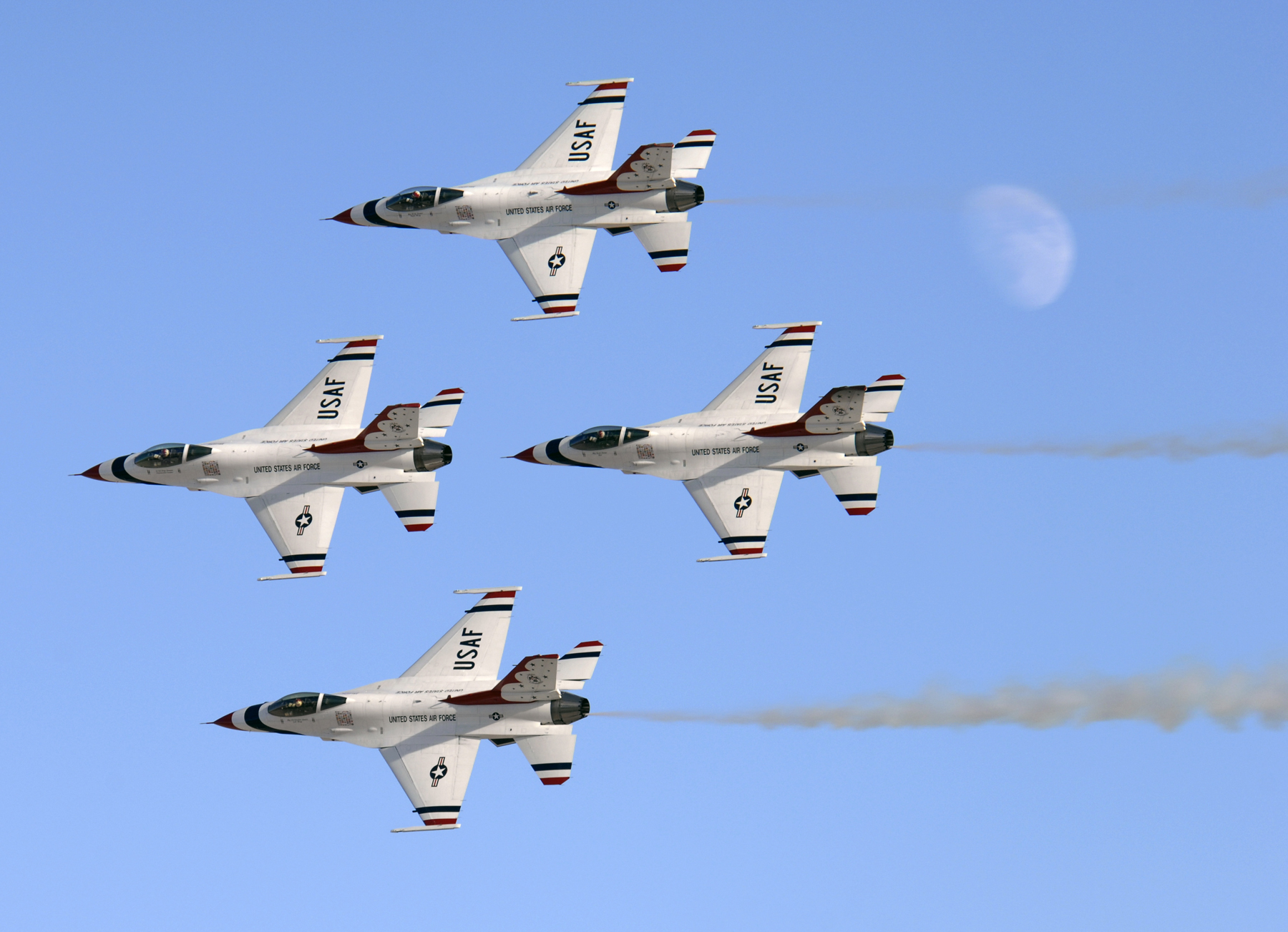 F-15 Fighting Falcons assigned to the U.S. Air Force Air Demonstration Squadron, The Thunderbirds, fly in formation during the air show at Nellis Air Force Base, Nev., Nov. 8, 2008. The Nellis AFB air show showcased the 21st-century Air Force’s capabilities in air, space and cyberspace. The show, held Nov. 8-9. is the largest aviation event in Las Vegas and the largest free public event in Nevada.(U.S. Air Force Photo/Senior Airman Larry E. Reid Jr.)
