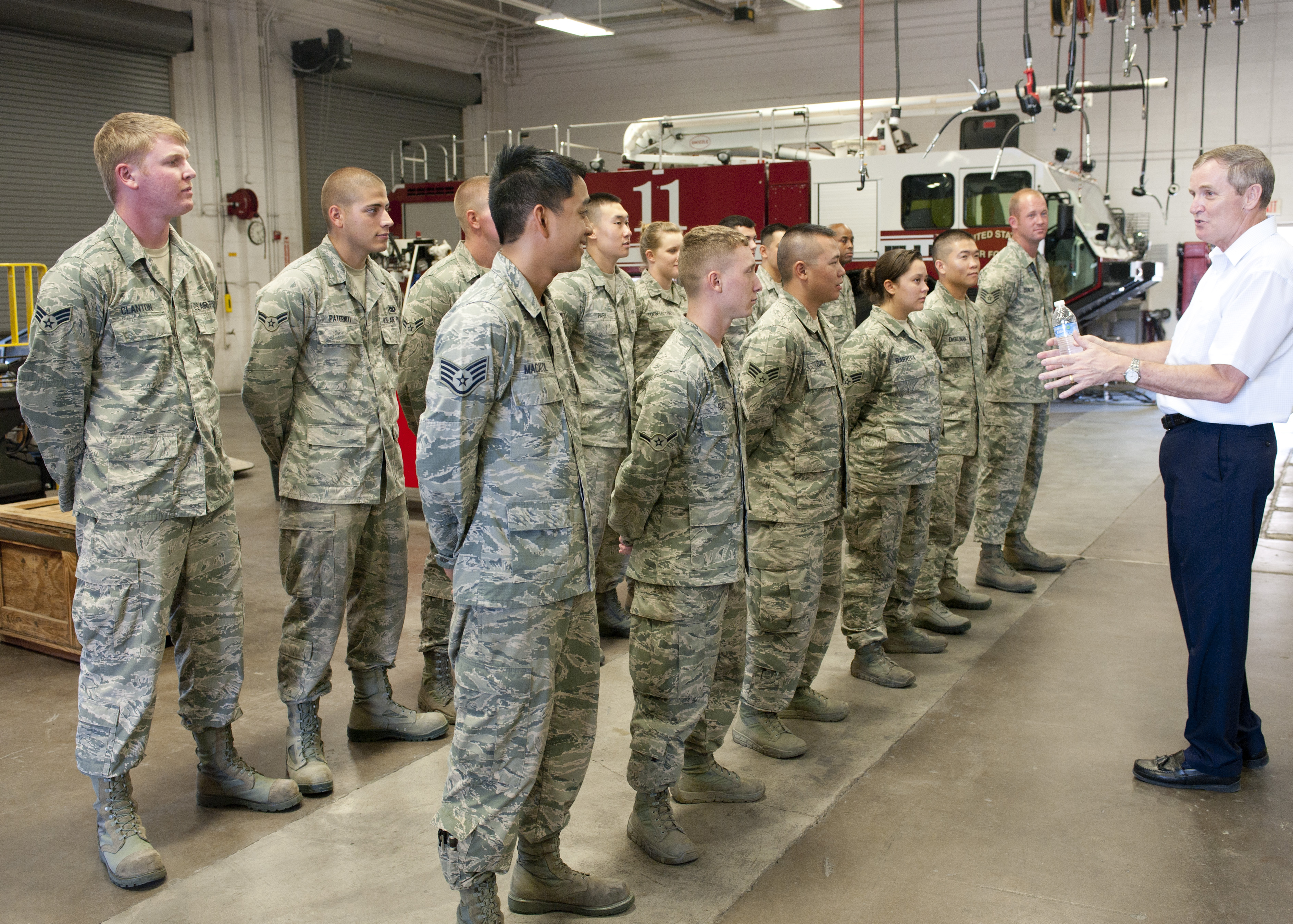 Retired Chief Master Sgt. Eric Benken, the 12th Chief Master Sergeant of the Air Force,, talks with members of the 99th Logistics Readiness Squadron Vehicle Maintenance Flight July 19, 2013, during an orientation visit to Nellis Air Force Base, Nev. Benken visited several locations at Nellis AFB including the Airman Leadership School, the 57th Aircraft Maintenance Squadron Lightning Aircraft Maintenance Unit and the 99th LRS. (U.S. Air Force photo by Staff Sgt. Michael Charles)